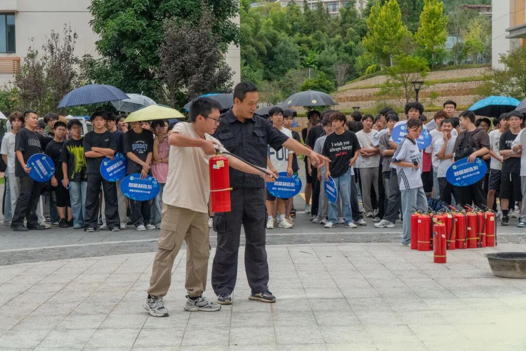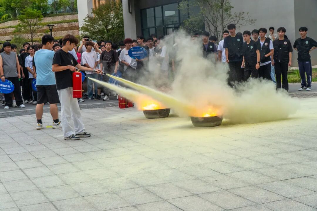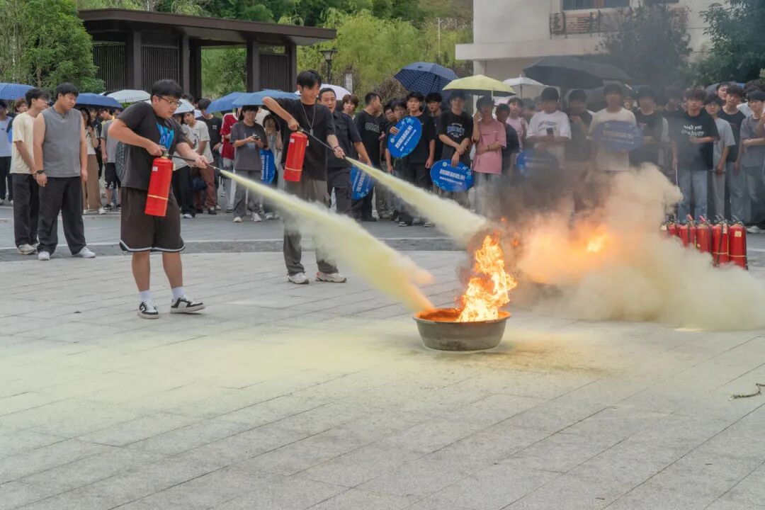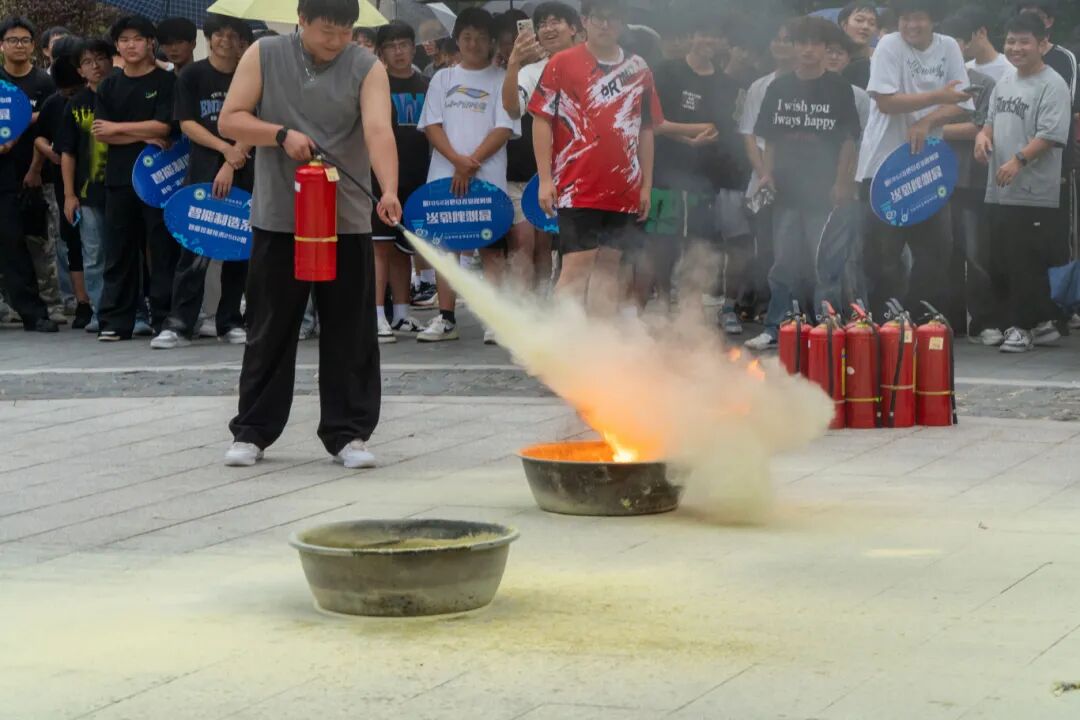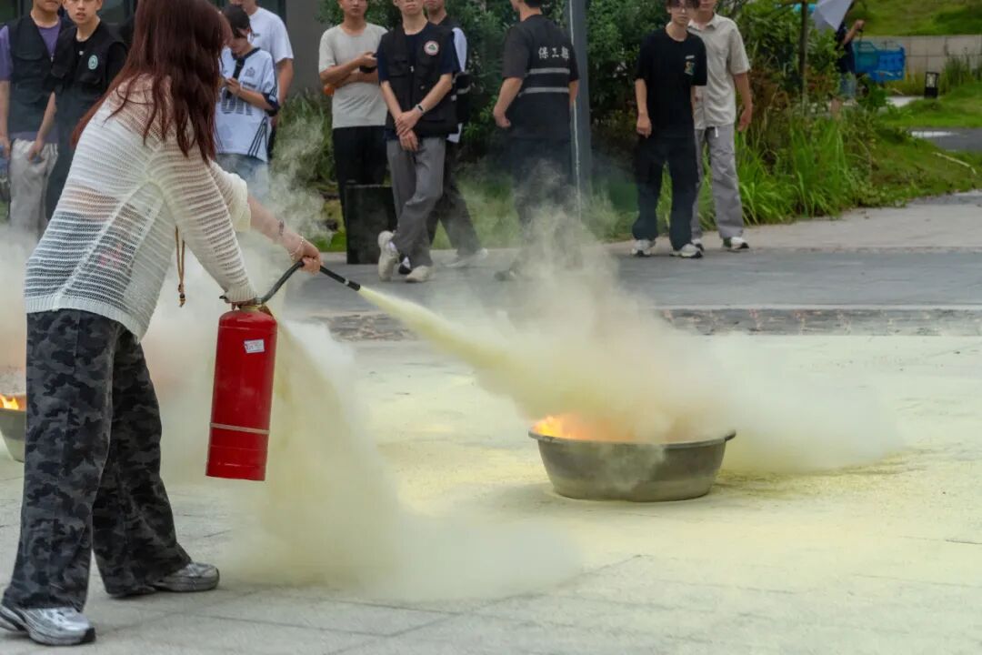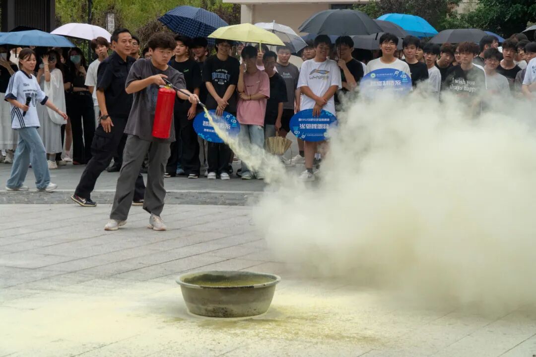 等到学生们成功逃生到空地后,讲师聚焦灭火器的使用方法,现场演示“提、拔、握、压”四步操作要领,并邀请同学们依次上场实践。在讲师的指导下,同学们亲手操作灭火器扑灭模拟火源,将理论知识转化为实际技能,进一步强化了火灾应急处置能力。