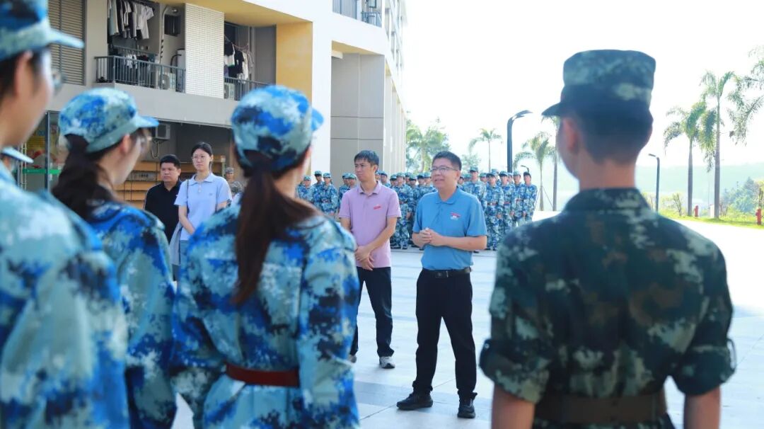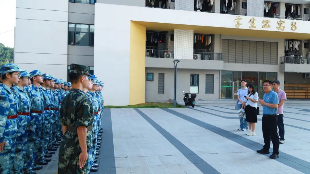 罗志斌书记一行先后查看各班训练情况,与教官、学生亲切交流。在训练场边,罗书记详细询问训练进度、学生适应情况及后勤保障工作,并对教官们的辛勤付出表示感谢。他勉励新生:“军训是磨砺意志的宝贵机会,希望大家以军人标准要求自己,在训练中培养坚韧品格,为大学生活打下坚实基础。”