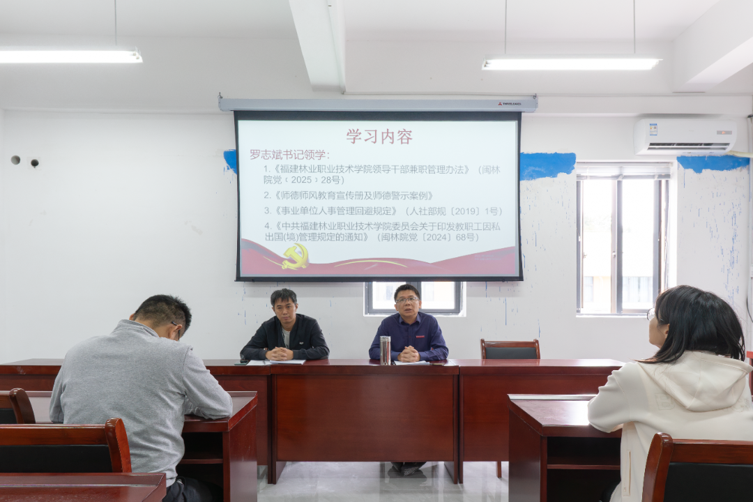 会上,系党总支书记罗志斌领学了《2024年新澳门原料免费领导干部兼职管理办法》(闽林院党﹝2025﹞28号)、《师德师风教育宣传册及师德警示案例》、《事业单位人事管理回避规定》(人社部规〔2019〕1号)、《中共2024年新澳门原料免费委员会关于印发教职工因私出国(境)管理规定的通知》(闽林院党〔2024〕68号)等文件。